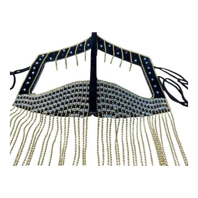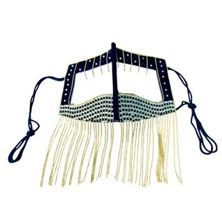 پارچه نقاب مشکی بوده وبا نگینهای رنگ مشکی ونقره ای بصورت شطرنجی پوشیده شده وبا زنجیر طلایی آویز درست شده ، محکم و کاملا حرفه ای ساخته شده که به هیچ حالت نگین وزنجیر آن ریزش ندارد ، استفاده آسان وبه آسانی روی صورت فیکس میشود