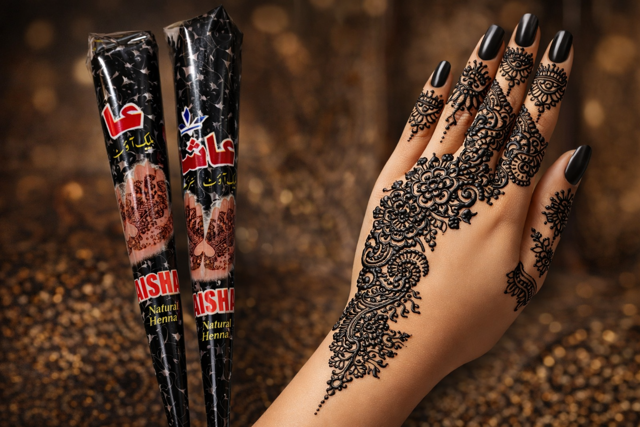 حنای مشکی قیفی عایشه انتخابی عالی برای طراحی نقشهای ظریف و حرفهای روی دست و پا است. این حنا با رنگ مشکی پررنگ و ماندگار، مخصوص اجرای طرحهای عربی، مجلسی و مدرن طراحی شده و بهراحتی روی پوست نقش میگیرد.