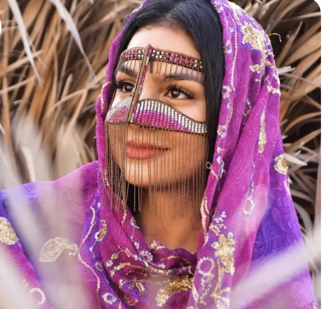 نقاب بندری به گویش محلی برقع پوششی زیبا وناز درست شده با نگینهای براق صورتی وسفید وزنجیر آویز بلند. روی صورت به آسانی فیکس و بسته میشود ، کاملا دوخت شده و بسیار محکم میباشد